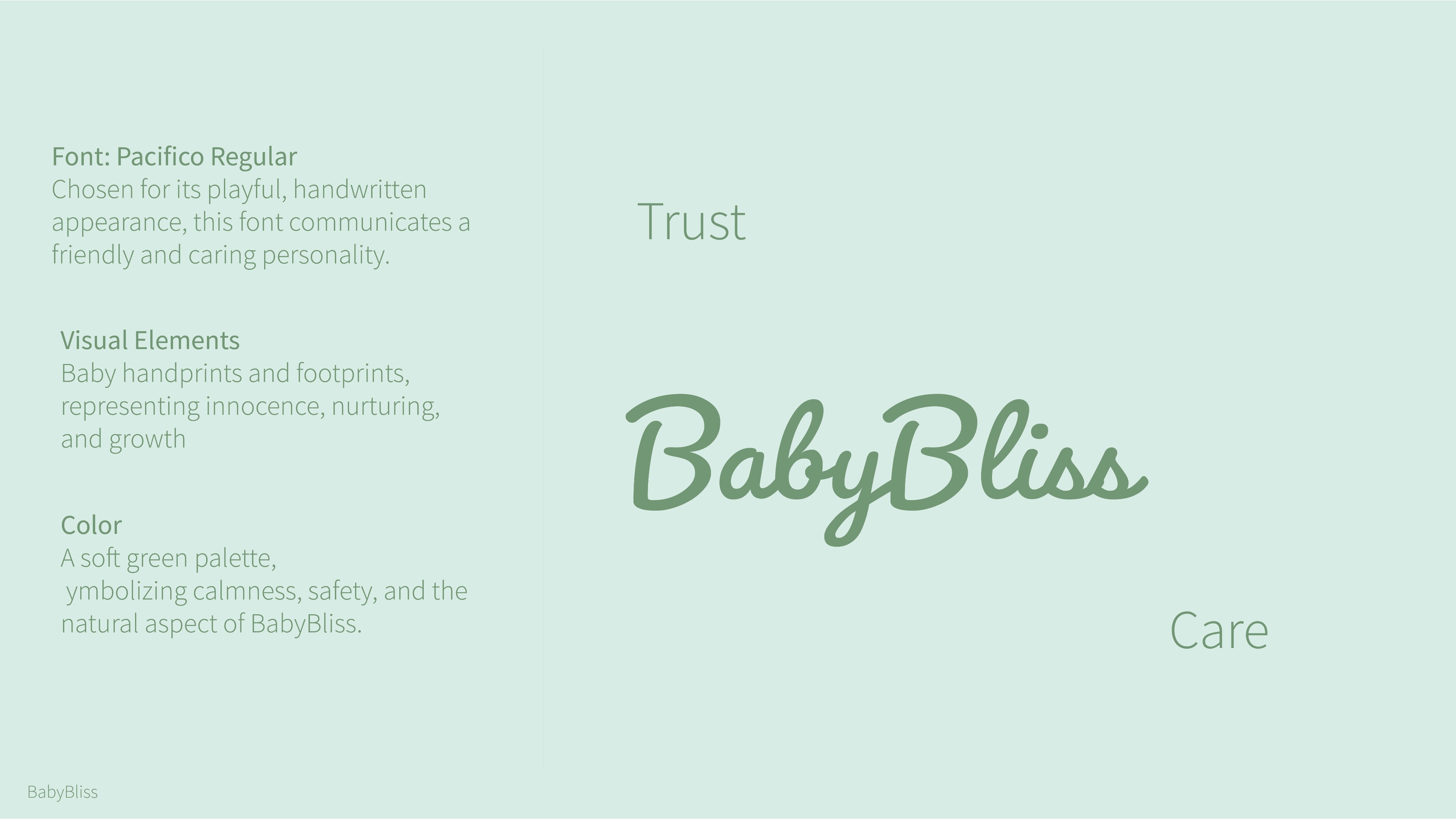 The typography for BabyBliss is carefully chosen to reflect the brand’s warmth, care, and trustworthiness. Pacifico Regular, with its smooth, flowing curves, brings a friendly and playful touch, perfect for the brand logo. Montserrat, a clean and modern sans-serif font, ensures readability across product labels, packaging, and digital platforms.