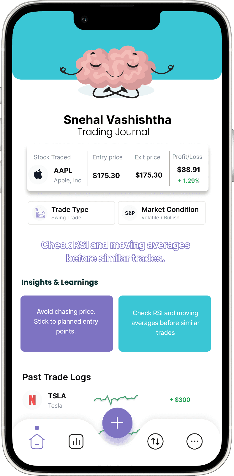 Priya is a 30-year-old IT professional who trades part-time to achieve long-term financial stability. Despite having a solid understanding of the market, she struggles to maintain emotional balance when market trends affect her portfolio. Priya finds it difficult to stick to her trading plan during turbulent markets and often feels stressed when her trades don’t go as expected. The emotional strain from trading sometimes spills over into her professional life, making it harder for her to focus at work. Additionally, Priya feels isolated in her trading journey and wishes to connect with others who face similar emotional challenges. She is looking for a solution that can help her reflect on her emotional patterns, stick to her trading strategy, and manage stress more effectively.